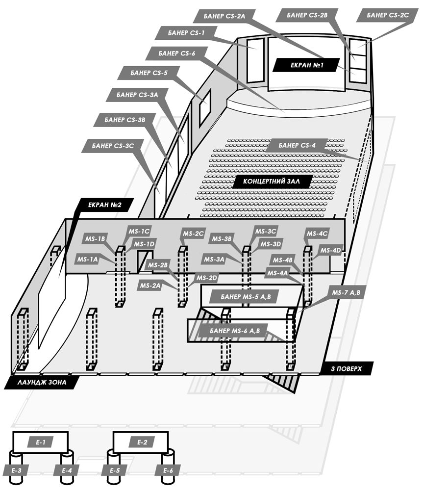 На банерах E-1 та E-2 розміщуються логотип концерту. Ці банери можуть працювати на Головного спонсора у разі внесення назви бренду чи компанії до назви концерту (внесено в офіційну пропозицію для Головного спонсора)
